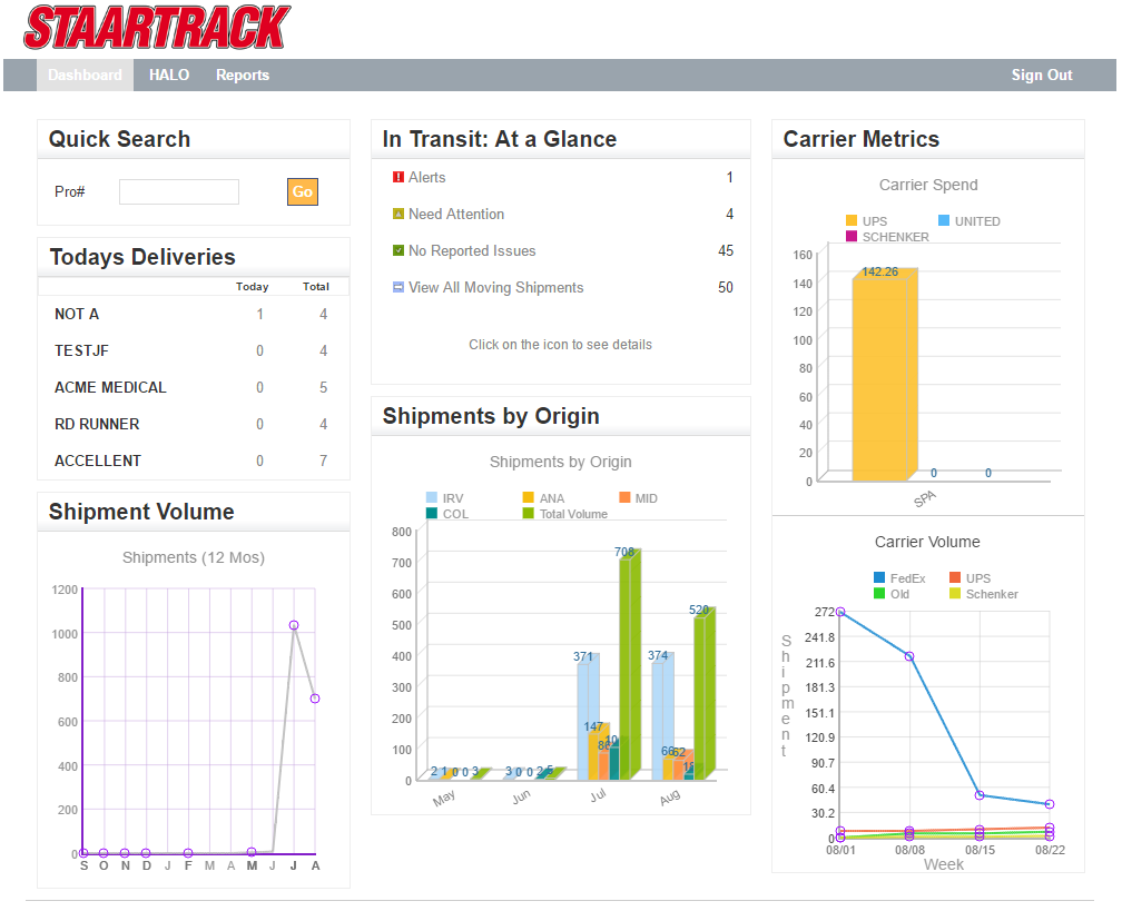 The STAARTRACK dashboard offers a concentric view within a single interface of all shipments moving with all carriers. More than just pickup and POD, STAARTRACK shows every scan and segment entry made by each carrier throughout the transit lifecycle of a shipment (origin to destination). When integrated, STAARTRACK can even provide the information related to the product inside each shipment.