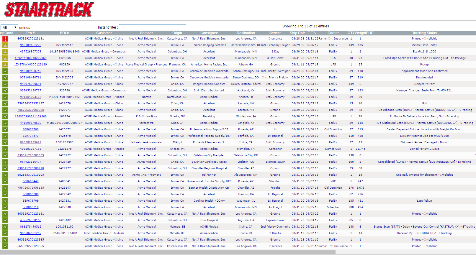 STAARTRACK transforms transportation data into meaningful information so transportation managers, customer service, and inventory control, etc. can see all shipments in motion via a single interface. If you want to know how your carriers are performing at any particular point in time, just look at STAARTRACK! If everything is green, there are no issues. If not, you'll know exactly which shipment(s) are distressed.